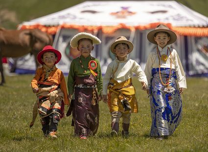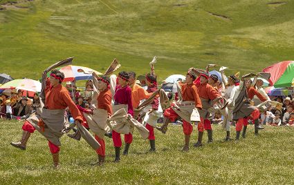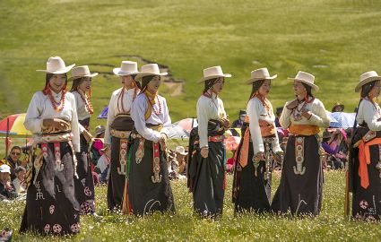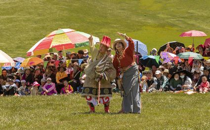 據(jù)說早在吐蕃時期,人們以村寨為單位,在本教僧人的帶領(lǐng)下高舉幡桿,手拿青棵、麥穗,繞田間地頭轉(zhuǎn)圈,祈禱神靈保佑,獲得豐收。儀式結(jié)束后,就在草場上展開角斗、斗劍、耍梭標等活動。格魯派興起后,這一活動仍得到保留,只是在繞地巡游時,人們要舉佛像、背經(jīng)文,文體活動也增加了賽馬、射箭、馬術(shù)、藏戲、民間歌舞等內(nèi)容。解放后,革去了繞地巡游等一些宗教儀軌,增加了許多休閑娛樂、物資交流的內(nèi)容?!巴?jié)”沒有固定日期,各地根據(jù)農(nóng)事而定,一般在秋收前(8月)擇吉日舉行,時間1-3天。