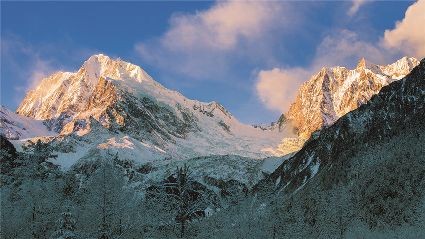 在一片片雪花的飄落中,冬天來了,它帶著風(fēng)、帶著雪,帶著讓人不禁要裹緊衣服的寒冷來了,萬物在冬的腳步中慢慢俯下身子貼緊了大地。蕭索、蒼涼、千里冰封、萬里雪飄……在這些形容冬天的詞語里,我們看到的是只有黑白兩色的畫面,黑的是物,白的是雪。但是,在甘孜州,冬天卻是色彩繽紛的,不僅有白的雪,還有藍的天、綠的水、黃的樹、紅的葉……還有炊煙升起的藏寨、水汽氤氳的溫泉和日照金山的美麗景致。