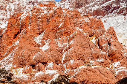 丹霞之美是無需雕飾的自然杰作。俯望之下,山體“色如渥丹,燦若明霞”,仿佛油畫創(chuàng)作中大筆涂抹的色塊,不加雕琢的姿態(tài)和毫不掩飾的奔放,展現(xiàn)了自然巨匠潛心創(chuàng)作的自信與率性。濃重的紅艷之上,稍覆冰雪之白,紅與白的碰撞如同冰與火的交融,于火熱熾烈間透出一抹冷峻肅殺。