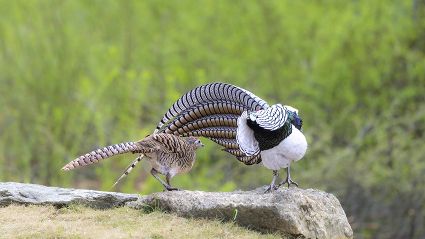 4月16日,筆者在康定市雅拉鄉(xiāng)境內,再次拍攝到國家二級保護動物白腹錦雞求偶的清晰視頻。一只色彩斑斕的雄鳥,拖著黑白相間的云狀斑紋尾羽,圍著雌鳥跳起了“圓舞曲”。整個求偶過程有十多分鐘。每年三至五月是白腹錦雞求偶期。