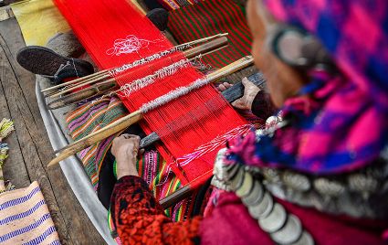 僜人俗稱“僜巴”,是一個(gè)生活在我國(guó)西藏邊境的族群,人口較少。僜人有自己獨(dú)特的語(yǔ)言,生活方式簡(jiǎn)樸,起居穿戴有自己的習(xí)俗。僜人織品色彩艷麗,主色為紅色、粉紅色,由于沒(méi)有圖紙,每位織娘僅憑記憶織出腦海中的花紋,所以每一幅織品都獨(dú)一無(wú)二。