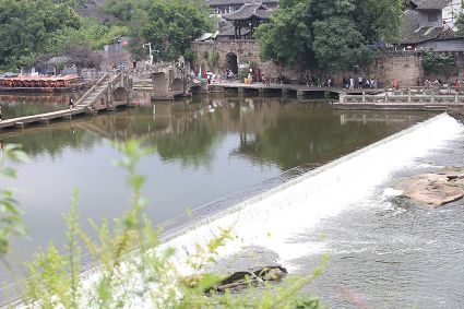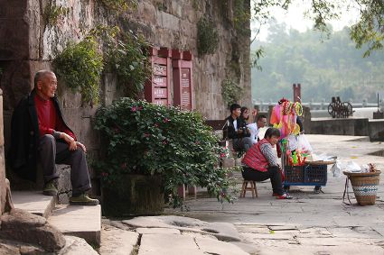 大榮橋。這座建在瀨溪河上、歷經(jīng)數(shù)百年的古石橋,一頭連著大足的地盤,一頭連著榮昌的地盤,故名。看大榮橋的最佳觀景點(diǎn)設(shè)在大榮寨對(duì)面的萬靈山腰,從那里看大榮橋和橋拱那端毗鄰的大榮寨,一種看白描連環(huán)畫中古鎮(zhèn)的感覺,就冉冉升起了。