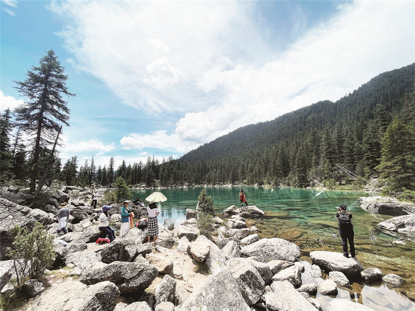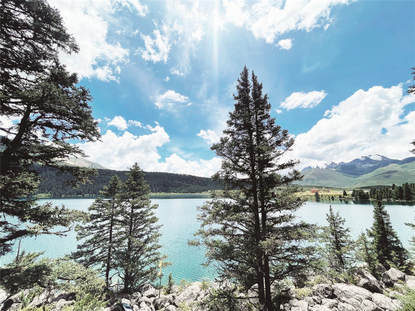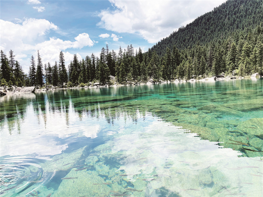 措普溝匯集了山川景物的精華,雪峰、冰川、原始森林、湖泊、河流、峽谷、瀑布、溫泉、草原、野生動植物、藏族風(fēng)情。特別是被雪山半環(huán)繞的措普湖,有山有水,顏色層層遞進(jìn),清澈見底,在陽光的折射下波光粼粼。