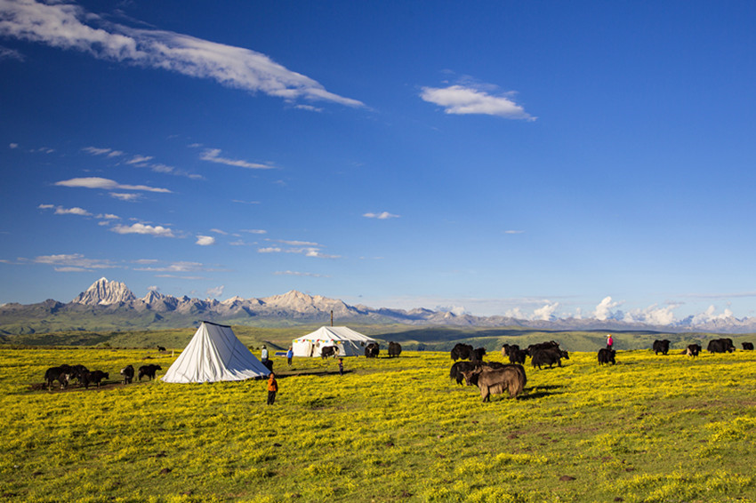 然后行走在山水之間,擁抱大自然,尋找屬于自己的“詩和遠方”。油綠的青稞、小麥,散發(fā)出濃郁的田園風(fēng)味;天邊群山起伏,磅礴的氣勢瞬間感覺人在自然面前實在太渺??;帳篷點綴著開滿野花的牧場,牦牛哞鳴,一片生機,細細體會牧民“逐水草而居”的生存智慧......
