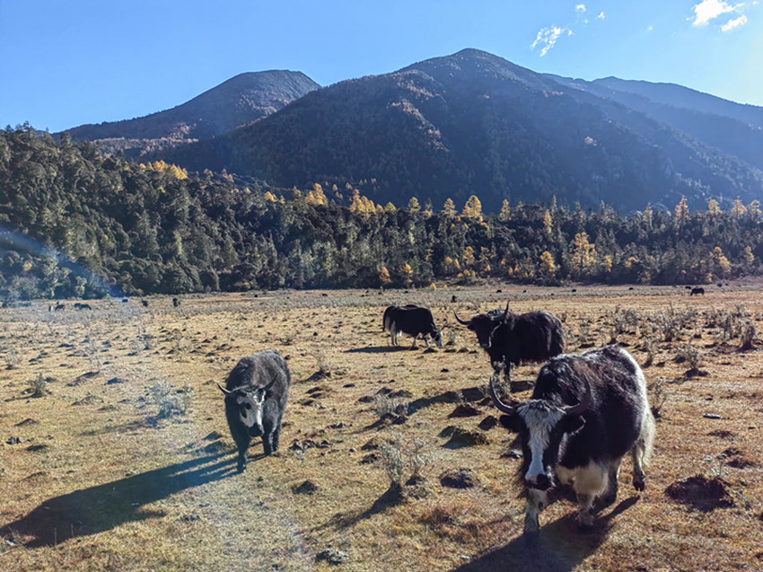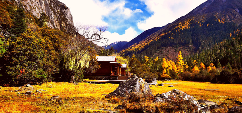 站在山谷放眼展望,金黃的草甸、蜿蜒透亮的小河、參天古木、悠閑啃草的牦牛,點(diǎn)綴其間的幾棟藏房,這一切構(gòu)成一個(gè)幽靜而神奇的世界。步入其間,就像走進(jìn)一個(gè)奇麗而孤寂的世外仙境以及純凈空氣的薈萃之地。置身其中,心曠神怡,仿佛自己是走在一幅渾然天成的美麗畫卷之中。