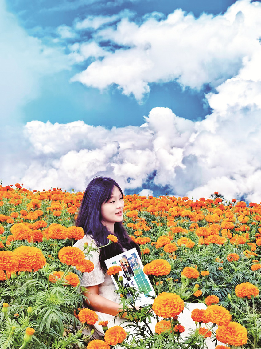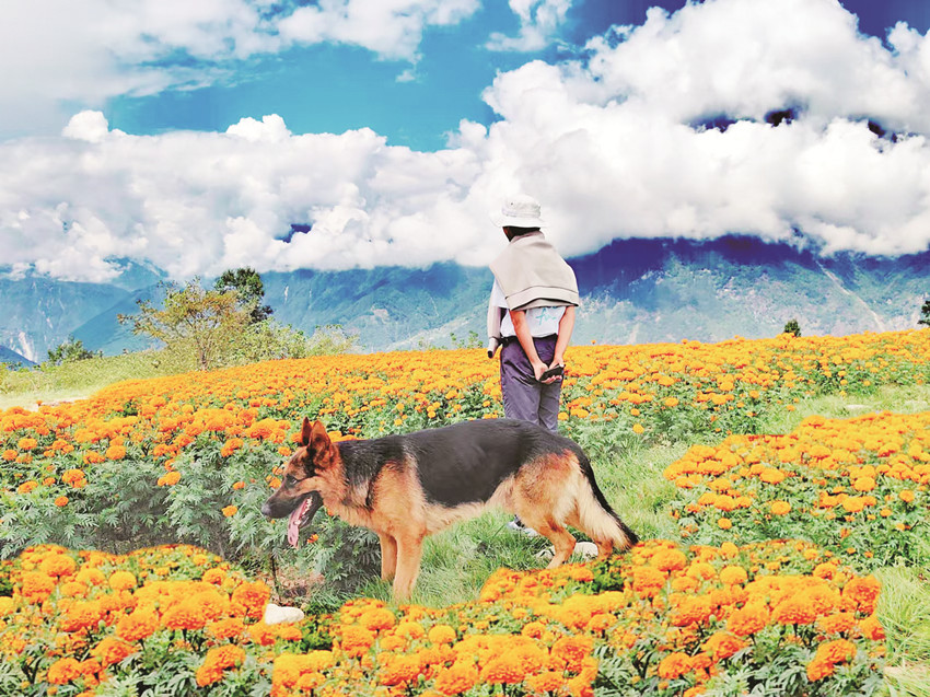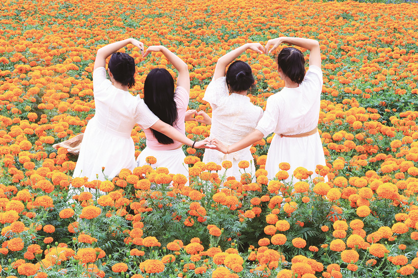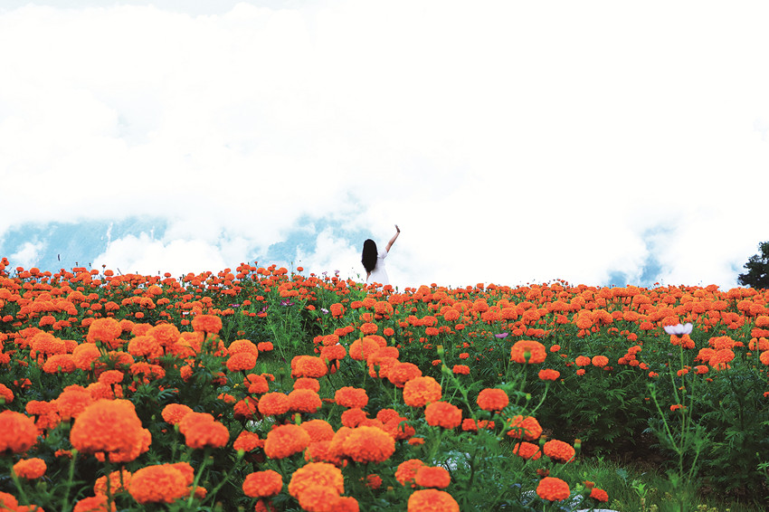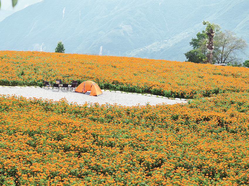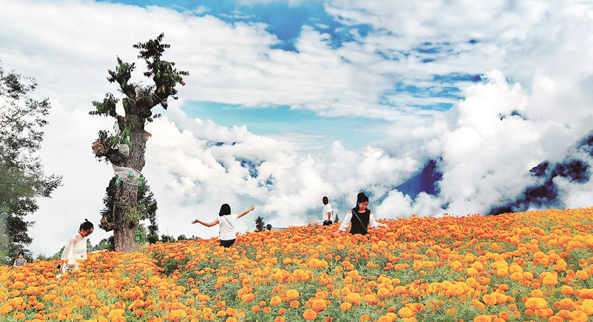 在這金風(fēng)送爽的秋日,瀘定德威加郡海子村18萬株萬壽菊競(jìng)相綻放,漫步在花海之中,人們可以感受秋風(fēng)的輕撫,呼吸清新的空氣,寧靜的村寨依托著貢嘎雪山、藍(lán)天白云,在成片的萬壽菊裝點(diǎn)下構(gòu)成了一幅亮麗的鄉(xiāng)村畫卷。