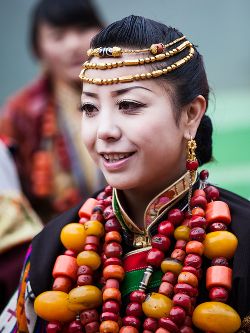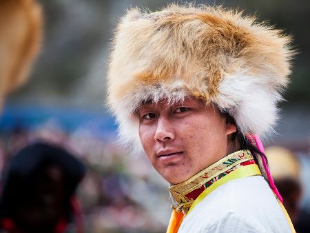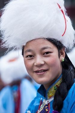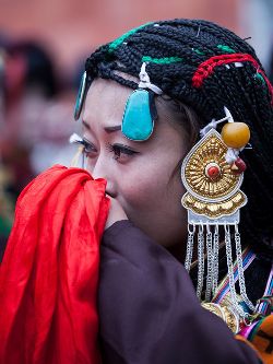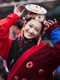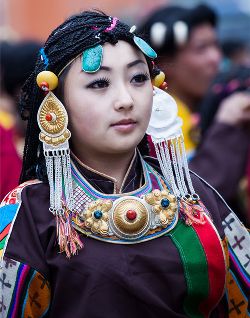 藏裝的基本特點是長袖、寬腰、大襟、肥大。直線寬邊,色彩對比強(qiáng)烈。男女藏袍均習(xí)慣以粗紡厚毛呢為料,左襟大,右襟小,一般在右腋下釘一個紐扣,或是用紅、藍(lán)、綠、雪青等色布做兩條飄帶,穿時結(jié)上。男式藏袍多為黑、白兩色,領(lǐng)圍、袖口、衣襟和底邊,鑲上色布或綢子底邊,古樸渾厚。夏天或勞動時,一般只穿左袖,右袖從后面拉到胸前搭在左肩上,也可左右袖均不穿,兩袖束在腰間,古銅色的皮膚袒露于外,雄風(fēng)凜凜,彪悍剛健。女式藏袍,分有袖和無袖的兩種,夏秋兩季的藏袍無袖。里面多襯有紅、綠等色彩鮮艷的襯衣,襯衣翻領(lǐng)在外,衣袖要長于胳膊一至二倍,長出部分,平時卷起,舞蹈時放下,舒展飄逸,瀟灑自如。藏族的帽子式樣繁多,各地均有不同,拉薩等地以金寶頂帽為最多,用金絲或銀絲繡織圖案,在陽光照耀下,閃閃發(fā)光。金花帽是男女老幼都喜歡戴的民族帽。男女穿的藏靴,底高二寸,靴腰高至小腿以上,靴面用紅綠相間的毛呢裝飾,繡有圖案花紋。靴頭向上隆起。藏族男女喜歡佩飾。耳穿大環(huán),手腕金銀,頂戴珠鏈,尤其是在腰間,男挎長劍,女佩腰刀,更顯得粗獷彪美。