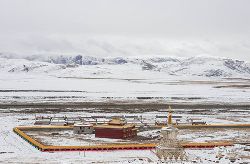 冬季的色達,常常被皚皚白雪覆蓋,民居、帳篷、寺院、經(jīng)幡、牦牛點綴期間,美麗迷人。