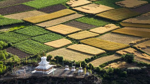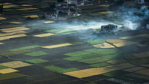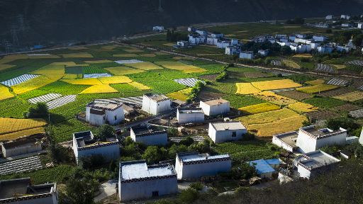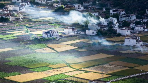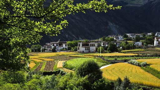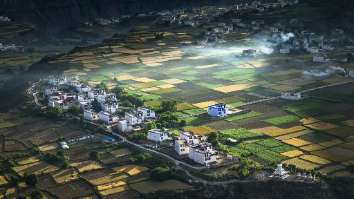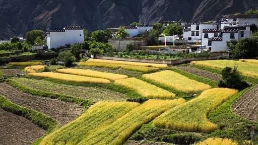 清晨,瓦藍(lán)瓦藍(lán)的天空云霧繚繞,周圍的景物一片朦朧,就好像童話里的仙境,一會(huì)兒,太陽(yáng)從東邊冉冉升起,霧也漸漸消失,村子里屋頂上飄著裊裊煨桑的煙子,我站在山岡上從高處向下俯望,只見高山峽谷之中,層層翠綠的梯田簇?fù)碇l(xiāng)城特有的白藏房,山下的田野,就像一片金色的海洋,將秀麗的田園裝扮得更加如詩(shī)如畫。一陣晨風(fēng)吹過(guò),麥田上蕩起了一道道金色的波紋,遠(yuǎn)處傳來(lái)了畫眉鳥的歌聲,我被眼前的一切迷住了,仿佛一切都靜止了,她讓我的夢(mèng)從這里開始。