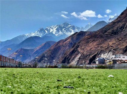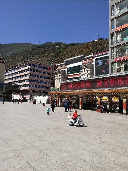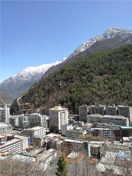 天空像剛被浸染的綢緞,蔚藍(lán)的主色已經(jīng)略顯;白雪好似從浸染的綢緞上滴落下的顏料與其它顏色的混合,眷戀的駐足在山尖,在其耳旁傾訴來年的約定;一顆顆萬年青穩(wěn)穩(wěn)的站立,將山中的寺廟、亭閣緊緊地包圍,見證著康定四季輪回的變化;依然披著秋冬贈(zèng)予黃色外衣的樹木,拋開桎梏,堅(jiān)守在一座座樓房旁。藍(lán)與白,黃與綠……這大美的晴天為人們帶來了別樣的視覺盛宴。