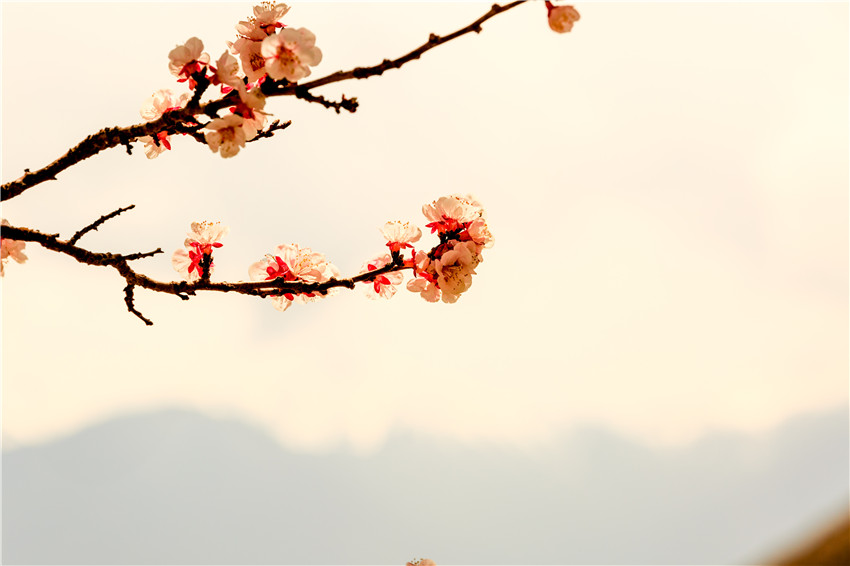桃花綻滿枝頭,日當村青山隱隱,