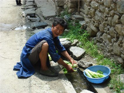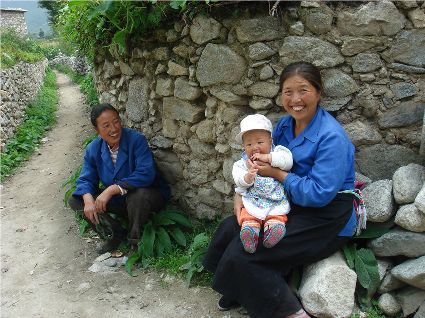 那天清晨,我們一行就乘坐曉雨哥所開轎車從康定城出發(fā)了。從顯得很懸的山路上到位于山頂平壩的嵐安古鎮(zhèn)時,才8點過一點。朝鎮(zhèn)里走去,先后見到了從地里背洋芋回家的小孩、從地里收了豆菽枯藤的中年人等。