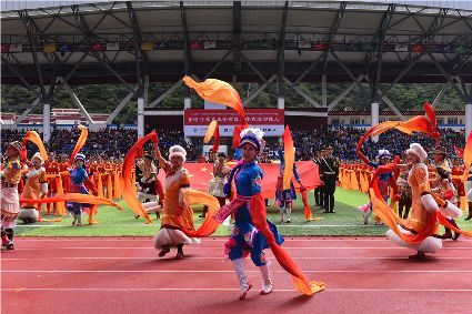 “本屆少數(shù)民族傳統(tǒng)體育運(yùn)動(dòng)會(huì)的會(huì)徽以格薩爾王賽馬登位為基本形象,由字母‘SC’組成的騎手代表‘四川’,數(shù)字‘15’組成了昂揚(yáng)奔騰的‘馬’為主體的形象,代表‘15屆民運(yùn)會(huì)’。這既有藏民族特色,又顯得美觀大方?!痹陂_幕式現(xiàn)場(chǎng),來自杭州的陳琳興致勃勃地說。