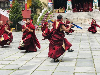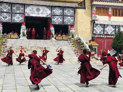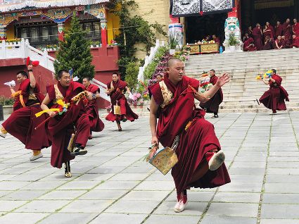 跳神儀式開始,南無寺內(nèi)鼓號齊鳴,喇嘛身著顯耀盛裝,點燃新綠松枝,幾縷藍(lán)色煙紋升起。一支由法鼓、鈸、海螺、法號等組成的寺廟樂隊自大殿而出,順時針繞場一周落座場邊,群神出場繞圈而舞,以示凈化場地,祈請諸神入位。接著,象征護法神舞、骷髏舞、鹿神舞、黑帽咒師舞和金剛力士舞的演員手持各類法器挨個入場手舞足蹈。舞蹈的起落根 據(jù)場邊奏響的器樂節(jié)奏進行。最后由眾神驅(qū)鬼逐邪,押送“朵馬”(由糌粑捏成用以供神施鬼的食品)至寺外拋丟焚燒,以示驅(qū)逐一年的邪魔,祈禱來年安樂。