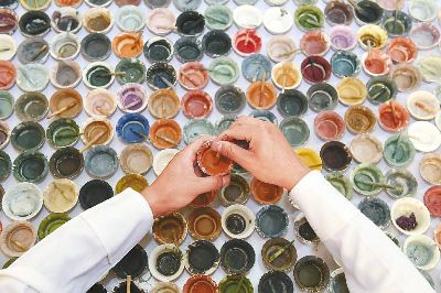 傳統(tǒng)的唐卡是藏族文化中一種獨具特色的繪畫藝術(shù)形式,需經(jīng)繃布、打磨、定位、起稿、涂色、暈染、拉線條、拉金線等多種程序,天然原料作色保證了畫作幾百年后色澤還依然鮮艷。在著著的畫室里,擺放了百個裝滿各色礦物質(zhì)顏料的調(diào)色小碗,“上色用的是延續(xù)千年的礦物研磨顏料。”為了讓顏料作色更均勻,著著還用自己的辦法搞出了專用的顏料攪拌機。