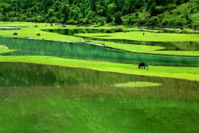 被原始森林和草甸環(huán)抱的五須海,當(dāng)?shù)厝擞鳛椤跋膳釆y的明鏡”,湖水碧綠透亮,將周圍的山水和天空全映照在湖面,幽靜的像一幅畫。從夏到秋周圍百花盛開(kāi),古樹(shù)盤根錯(cuò)節(jié)、藤枝攀沿纏繞,杜鵑樹(shù)伸向湖面,仿佛進(jìn)入原始古樸的仙境。