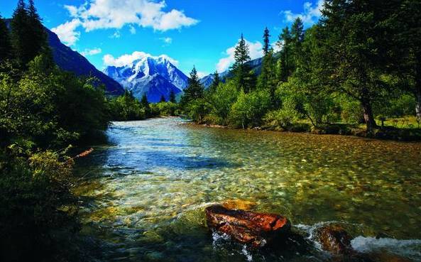 雅家埂位于海螺溝范圍內(nèi),四周環(huán)繞著終年不化的雪山、瀑布、草甸、杜鵑花、冷杉林。冰川河岸上布滿了數(shù)不清的紅石,與清洌的流水相伴順流而下,讓人感嘆大自然的造化神奇。孫儷鄧超主演的仙境電影《畫壁》,就曾在此取景拍攝。