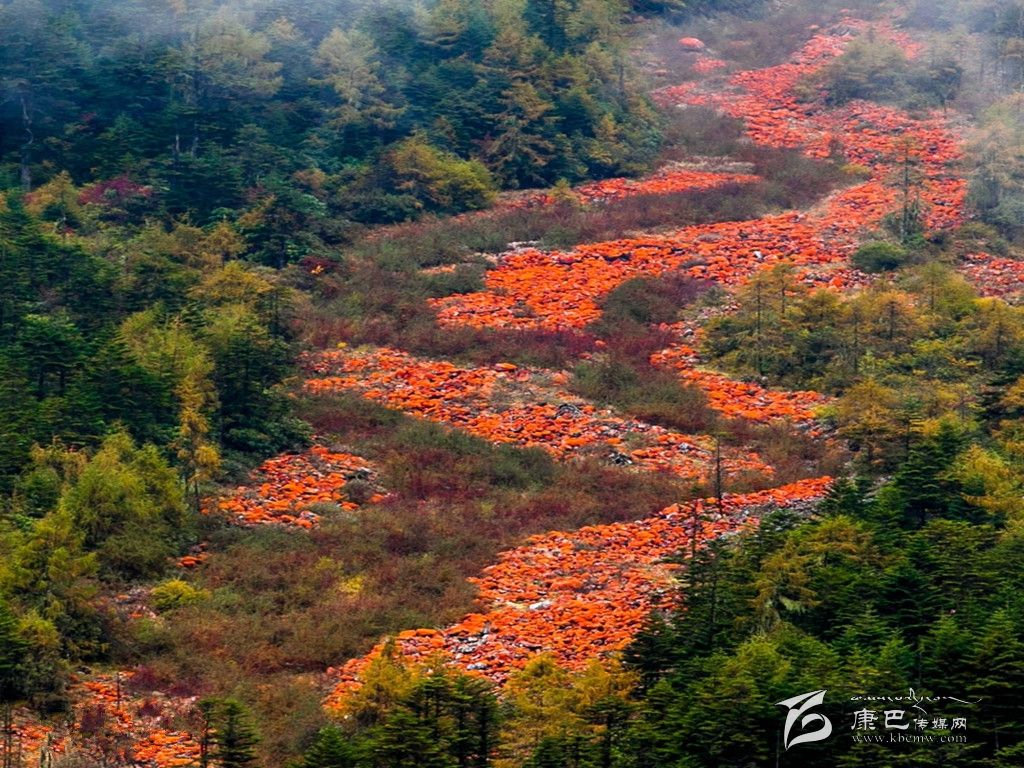 翻越雅家埂啞口的路是一條盤(pán)山路。十幾年前我就走過(guò)這條路,那時(shí)被我驚鴻一瞥的紅石頭,規(guī)模不大,現(xiàn)在對(duì)面山脈上一條叫黑溝的河谷中的紅石灘煞是壯麗。當(dāng)車(chē)盤(pán)旋而上的時(shí)候,在路上任何一個(gè)地點(diǎn)停車(chē),都是最好的觀(guān)景臺(tái)。奇麗的紅石灘從一座雪山上蜿蜒而下,好像一道紅地毯從雪山翠柏中鋪下來(lái),地毯上編織著圖畫(huà):河流分分合合,云杉斑斑點(diǎn)點(diǎn)遺憾的是河谷后面的雪山被雨霧遮掩著,始終沒(méi)有露面。