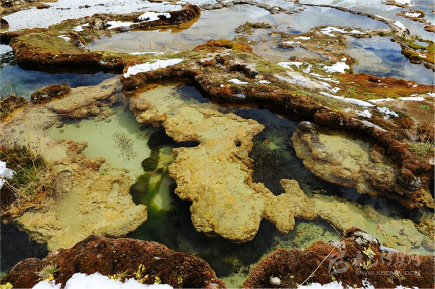 灘長約3000米,寬約200米,共有7個臺階,上面形成了大小不一的彩池,里面的各類水生植物,暢游的羌活魚(小鯢)等,給這片古老的地質(zhì)奇觀帶來了無限的生機。在海拔4300米處,有一眼噴出1.5米高的溫泉,水溫常年在30度左右,是玉龍泉華灘的主要水源。