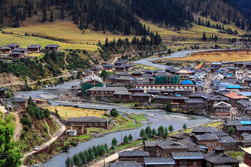 石板藏寨保留著原始的藏式民居文化,一宅一院,一磚一瓦的建造都是居民用石板蓋成,錯(cuò)落有致、古樸大氣。這里地勢(shì)平坦、神山環(huán)抱,開闊的草地上河水蜿蜒流過,百花盛開五彩斑斕,美景恍若天堂,藏房令人向往。