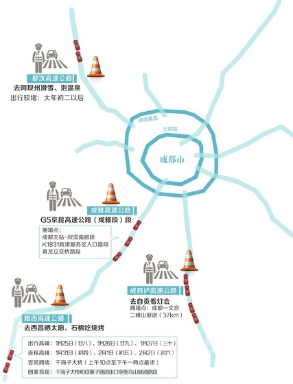 回成都如遇擁堵,交警建議,從瀘州、自貢出發(fā)回成都的車(chē)輛,可在成自瀘高速寶飛或仁壽站下高速,經(jīng)老成仁路返回成都;自貢、內(nèi)江的車(chē)輛不一定非要來(lái)擠成自瀘,可選擇樂(lè)自、宜瀘、樂(lè)宜高速返回成都。如果成都站出站車(chē)流量大,可選擇大林站、興隆站,從老成仁路、雙流錦繡東山快速通道到成都。