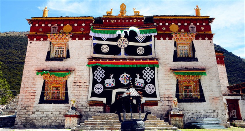 沖古寺既是觀賞三座神山的必經(jīng)之地,也是當(dāng)?shù)夭刈迦罕娹D(zhuǎn)山儀式的出發(fā)地。沖古寺前的沖古草坪風(fēng)景一流,并且在此可以以很好的角度觀賞到仙乃日和夏諾多吉。