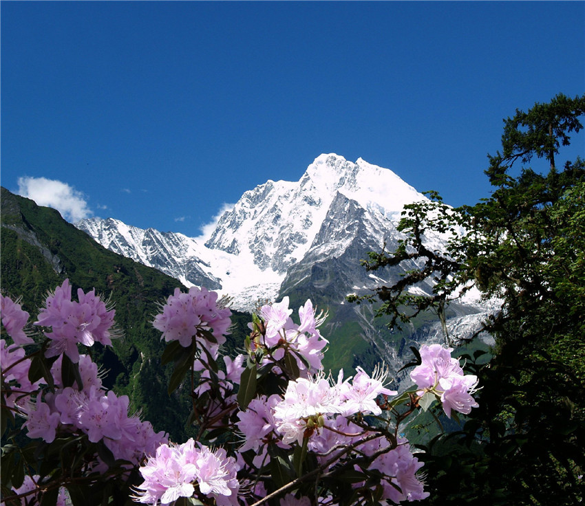 從海螺溝翻越雅家埂到康定的道路兩旁有很多品種的杜鵑花,埡口海拔1000米下生長(zhǎng)的杜鵑花樹高大,以緋紅色、粉紅色、紫色為主。海拔越高,花樹越矮,從山頂?shù)缴窖恢变佒氖前咨幕ǘ洌袷墙豢椩谏揭暗陌谆ǖ靥骸?/p>