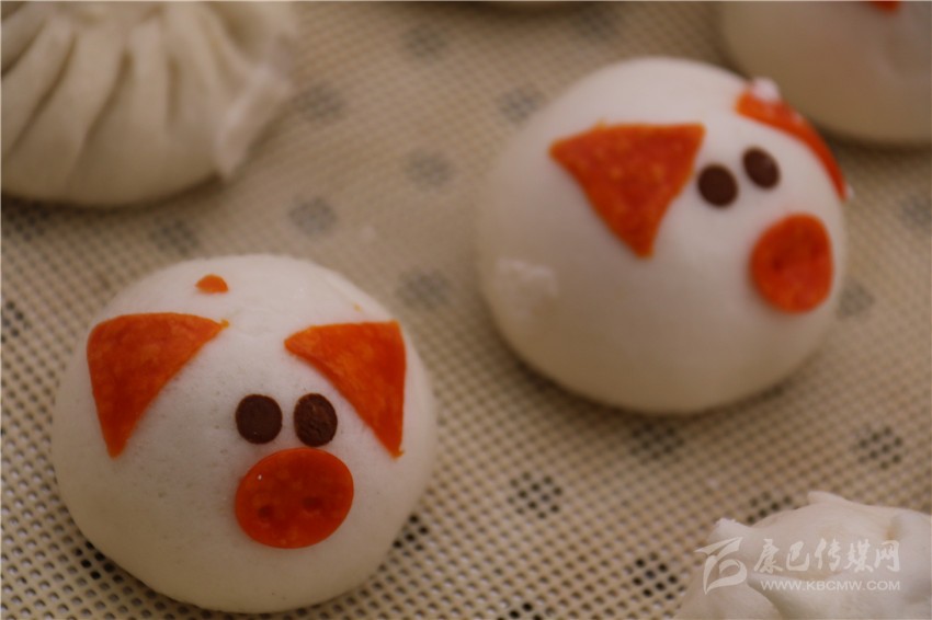 “這個(gè)包子也長得太可愛了吧!”記者順著旁邊的驚呼聲看去,五歲的肖紅拿著一個(gè)做成小豬樣的包子對(duì)著她奶奶說。趕緊走近店里,記者也來了份兒奶黃餡兒的卡通小豬包子,一口咬下,奶黃順著缺了的口子流出來,趕緊吸了一口,甜甜的味道瞬間在舌尖化開。為了滿足記者的好奇心,老板介紹說:“將面團(tuán)捏好搟薄,再包入餡,收口朝下,像包包子那樣捏好口,捏出有點(diǎn)像豬的型狀,再撕一點(diǎn)黃色面團(tuán)做個(gè)豬鼻子,用一根筷子按下去成兩個(gè)鼻孔,再捏兩只耳朵和一根尾巴,準(zhǔn)備些黑芝麻,做眼晴,拿根筷子點(diǎn)點(diǎn)水沾一個(gè)芝麻放在豬身上,可愛的卡通小豬包就做好了。”店鋪前擠滿了小朋友,老板告訴記者:“這種卡通包子之所以受小朋友的喜歡不僅是因?yàn)槠淇蓯鄣目ㄍㄍ獗?,而且我們所有的卡通包子餡兒都是甜的。我們精準(zhǔn)定位,投孩子們所好,取得的成效還不錯(cuò)。這次來參加美食節(jié),只帶來了小豬和刺猬兩種卡通形象的包子,賣得挺好,準(zhǔn)備在接下來的幾天將小猴子等卡通形象的包子也帶過來。”