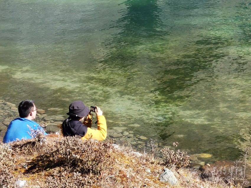 白海子的美較其他海子來說,就在于湖水的顏色,貢嘎青旅的顧問狼哥介紹說,現(xiàn)在大家喜歡叫白海子為翡翠海,就是因?yàn)樗念伾?,如一塊藍(lán)綠的翡翠鑲嵌在高山的懷抱中,隨著光線的不同顏色變幻莫測(cè)。在康定的眾多海子中,這樣的顏色很少見,也更吸引人。