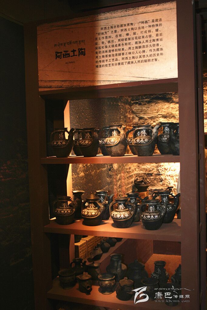 阿西土陶是藏家傳統(tǒng)土法制作的手工藝品,又稱(chēng)藏族黑陶,因其燒制后呈黑色而得名。阿西土陶以當(dāng)?shù)匾环N特殊的泥土為原料,加上其他兩種泥土混合而成,制作中不斷地捏、錘、敲、打,使之成型,還要用碎瓷做出花紋來(lái)點(diǎn)綴,最后架起松柴點(diǎn)火燒,在燒紅的土陶上灑上麥糠就呈現(xiàn)出黑色了。阿西土陶主要表現(xiàn)為陶鍋、陶罐、陶盆、陶壺、陶瓶等形式。最初,當(dāng)?shù)厝艘蕴斟伒葥Q取其它地方的糧食或其它物品,現(xiàn)今的阿西土陶則已經(jīng)走向市場(chǎng),更多地作為旅游商品和本地人的家庭裝飾品。