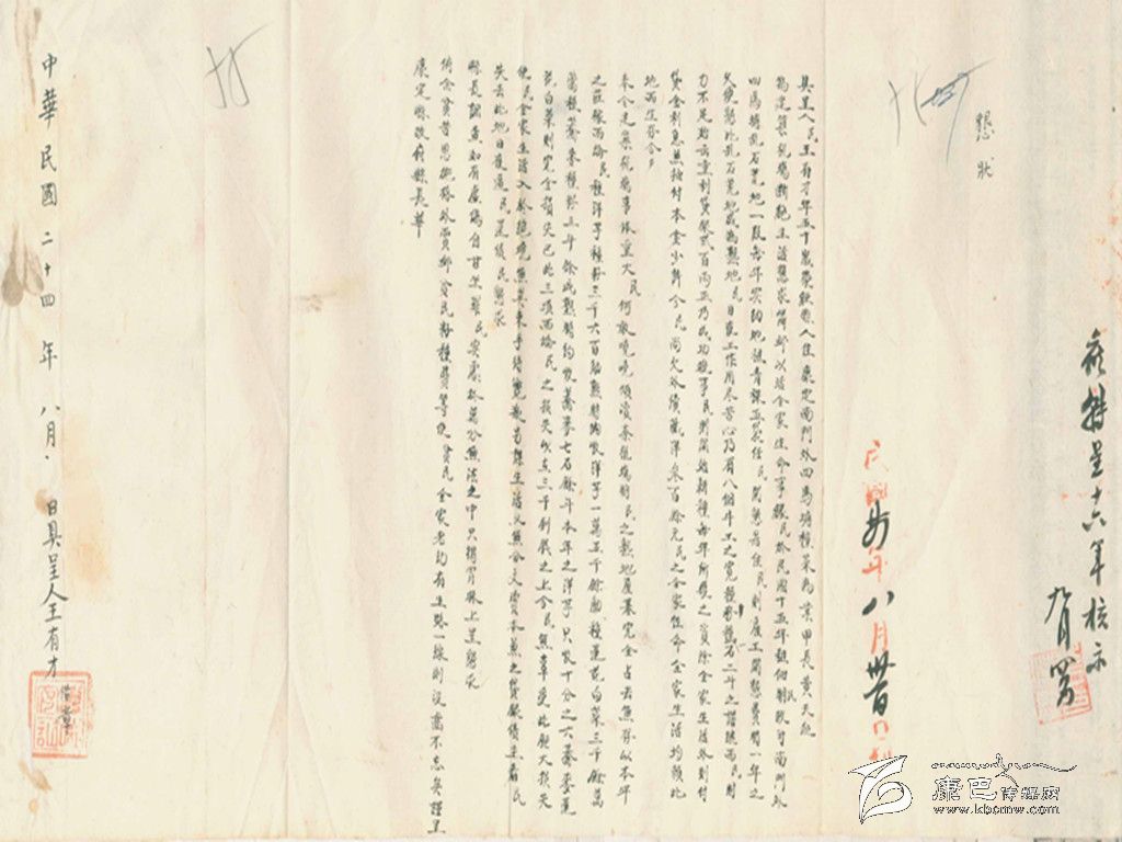 當(dāng)年國(guó)民黨一支中央軍在康定南郊修建了飛機(jī)場(chǎng),其地址就在如今煙草公司到軍分區(qū)那一帶。這是個(gè)從來沒有發(fā)揮過作用的飛機(jī)場(chǎng),過去一直以為那地方完全是荒蕪的河灘地,通過這份由一位名叫王有才的菜農(nóng)在1935年呈給縣長(zhǎng)的“懇狀”,可以看出那地方其實(shí)也有可以種植出小菜的熟地。