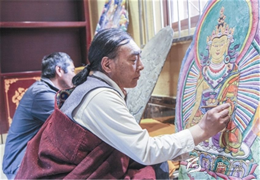 從子承父業(yè)再到吸眾家之長(zhǎng),自離開故鄉(xiāng)的那天起,巴德的視野開始變得開闊起來(lái)。1979年到省藏校學(xué)習(xí)藏文和美術(shù),并開始涉獵泥塑技藝,隨后又向德格民間藝人扎西澤郎學(xué)習(xí)彩繪石刻,然后又到西藏、甘肅等地學(xué)習(xí)繪畫、石刻技藝。巴德說(shuō),自己之所以有今天的藝術(shù)造詣,是因?yàn)橛幸慌麕熤更c(diǎn),是因?yàn)樽约旱牟粩嗵剿骱烷L(zhǎng)期堅(jiān)守。讓他欣慰的是,自己的三個(gè)兒子都在學(xué)習(xí)石刻和繪畫,親戚朋友中的十多個(gè)孩子也成了他的入門弟子。