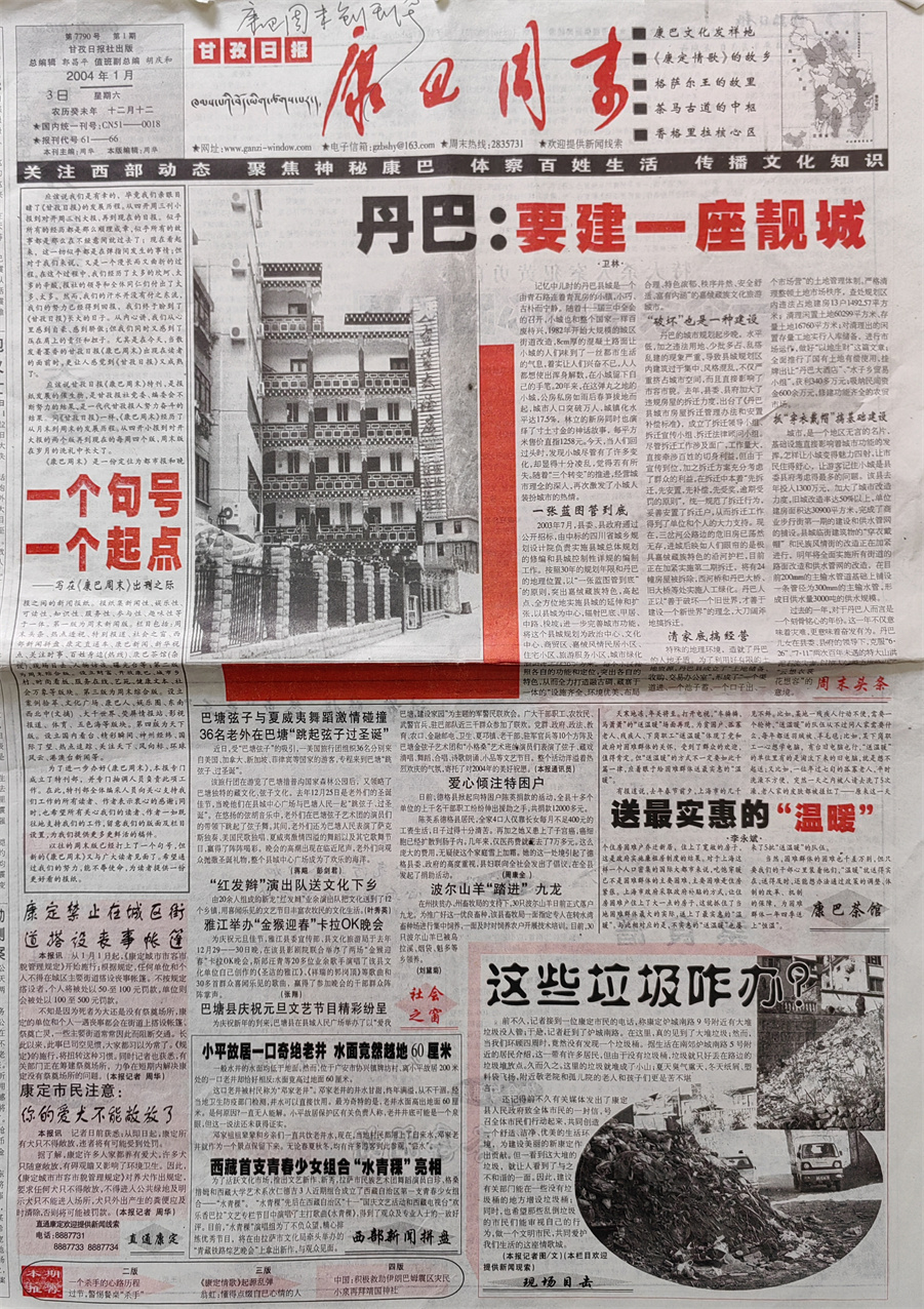 經(jīng)過(guò)緊鑼密鼓的籌措后,2004年1月3日,也就是在《甘孜報(bào)》正式改為《甘孜日?qǐng)?bào)》的第三天,第一期《康巴周末》與讀者見(jiàn)面了?!犊蛋椭苣穭?chuàng)刊號(hào)的報(bào)頭是時(shí)任《甘孜日?qǐng)?bào)》社副總編輯胡慶和先生書(shū)寫(xiě)的,同時(shí)還配發(fā)了我撰寫(xiě)的題為《一個(gè)句號(hào)、一個(gè)起點(diǎn)》的發(fā)刊詞。創(chuàng)刊號(hào)第一版推出的是周末新聞版,當(dāng)期與讀者見(jiàn)面的欄目包括:周末頭條、社會(huì)之窗、直通康定、現(xiàn)場(chǎng)目擊、康巴茶館、西部新聞拼盤(pán)等;第二版為周末綜合版,推出的是案例拾萃、健康文本欄目;第三版為周末綜合版,推出的是文化廣場(chǎng)欄目;第四版為天下版,推出的是國(guó)內(nèi)外奇聞逸事。此外,《康巴周末》創(chuàng)刊伊始,還推出了有獎(jiǎng)?wù)骷侣劸€(xiàn)索活動(dòng),凡是提供有一定新聞價(jià)值的社會(huì)新聞,經(jīng)采訪核實(shí)后,都會(huì)給予線(xiàn)索提供者一定獎(jiǎng)勵(lì)。這種線(xiàn)索征集活動(dòng),不但擴(kuò)大了新聞源,還在一程度上為《康巴周末》迅速贏得讀者的青睞起到了推波助瀾的作用。直到后來(lái)在舉辦《康巴周末》創(chuàng)刊一百期活動(dòng)時(shí),讀者還對(duì)此給予了充分肯定。