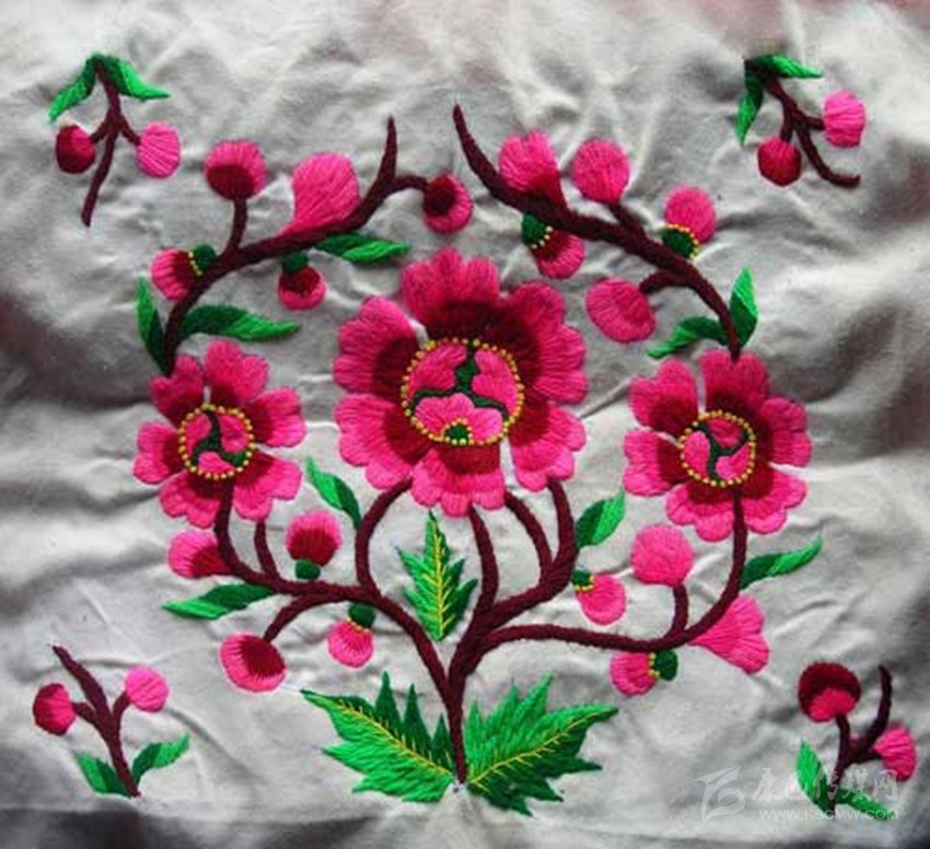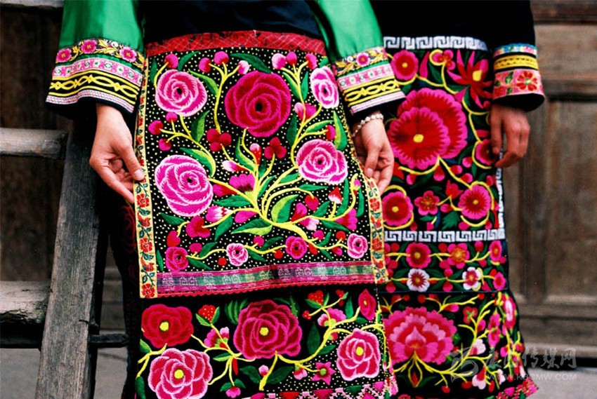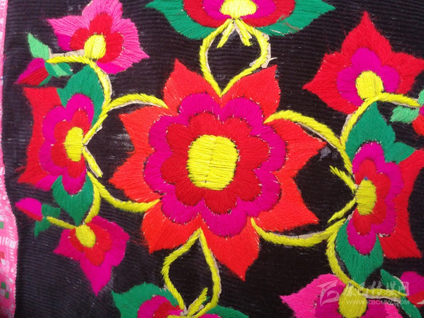 在這里,婦女們猶愛花草。所以,他們的刺繡作品,有生活的細節(jié)滲透,如氣息,若有似無,相互浸潤。無論是花蔓纏枝,還是朵花團簇,都從生活中提煉,視之便信手拈來,放在青布黑衫之上,鮮艷奪目,張顯著生活在這方水土之上,人們獨特的審美情趣。