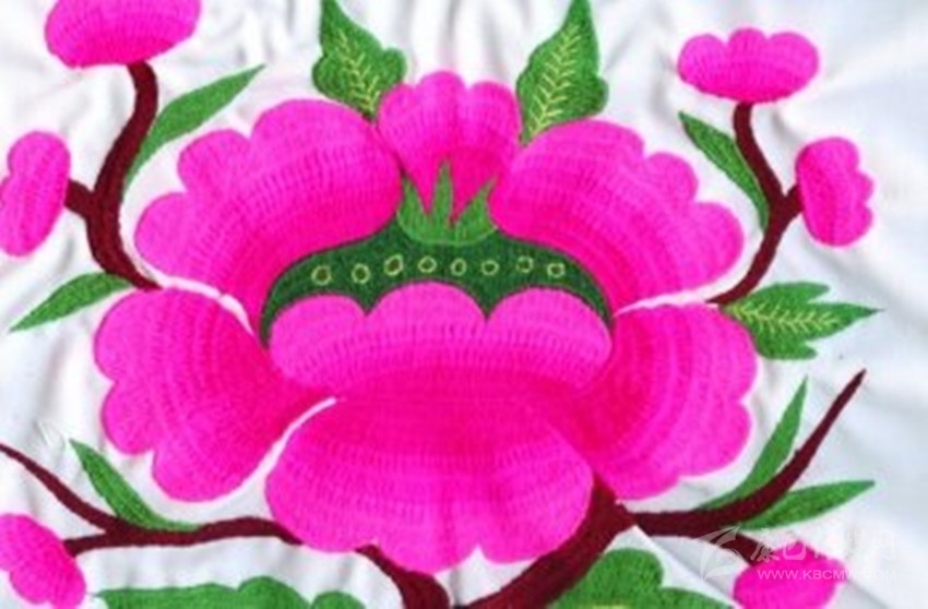 在魚通,刺繡以花朵為主。會繡花的女人,被稱為“花匠”?!靶』ń场眰儚氖鄽q就開始接觸刺繡,通過年長者口傳身授,自學的方式成為一代繡女。稚嫩的雙手,再經(jīng)過時間的洗禮,刺繡的技巧早已爛熟于心,在心的指引下,穿針引線,針尖如麥芒,各色陪底線來回,穿梭于布料的經(jīng)緯之間。買回青布,從下手的第一針開始,整幅圖的構(gòu)架便了然于心,各式花朵圖案成竹在胸,線條在暗自游走,勾勒越來越清晰。每一次的飛針走線,是婦人手上的一針針,一線線,都在為作品最后的完美收關(guān),錦上添花,做著必不可少的鋪墊。