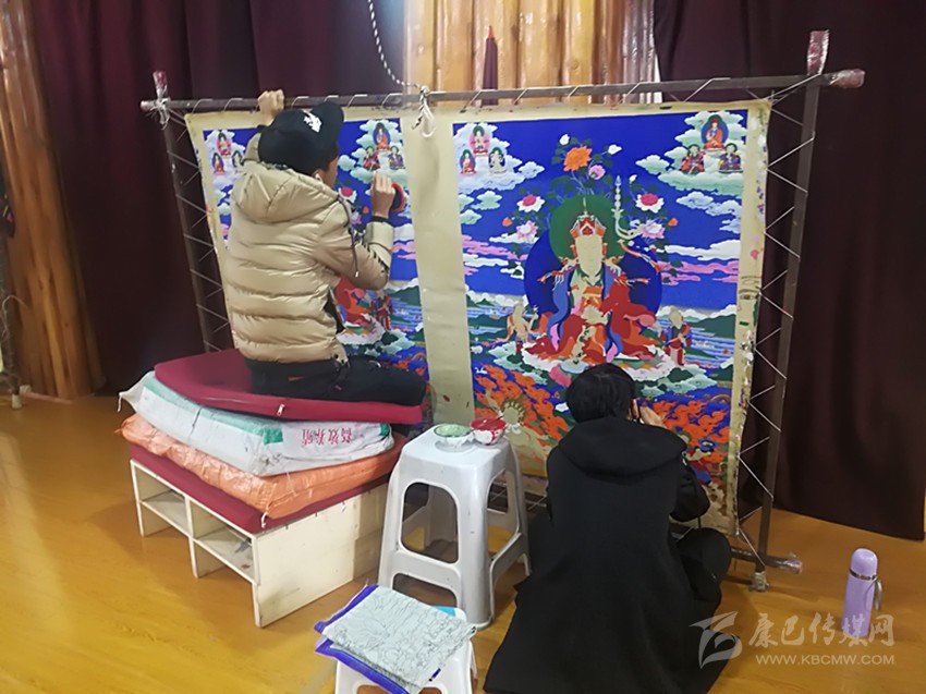 今年初秋,在爐霍縣郎卡杰唐卡演展中心門外場地上,三位學生正在打磨用牛膠和礦物粉浸潤后晾干的畫布,他們將畫布平鋪在木板上,用倒扣的瓷碗一遍遍仔細地磨著。這是繪制唐卡的最初階段,也是爐霍縣唐卡協(xié)會專門為廣東媒體甘孜文化行記者安排的觀摩節(jié)目,讓大家迅即有零距離接觸唐卡的感覺。爐霍縣文化館館長、郎卡杰唐卡繪畫藝術協(xié)會會長雍珠洛吾由此開始,一步步帶我們走進唐卡制作和郎卡杰唐卡藝術的世界。