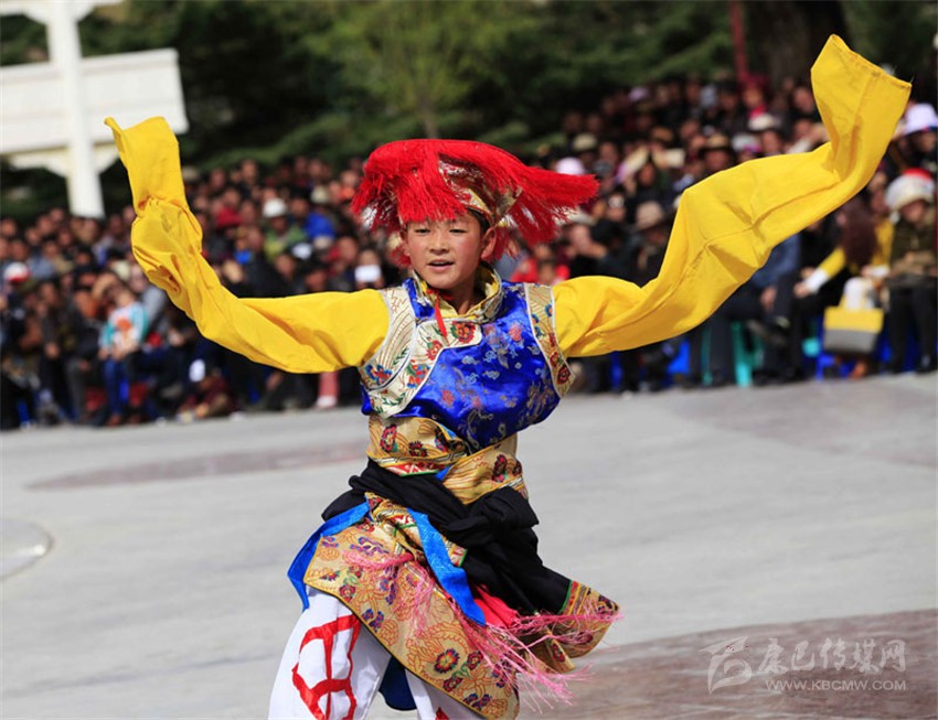 與藏族鍋莊不同,巴塘弦子在表演時,隊伍前面由數(shù)名男演員手持拉弦樂器“畢旺”,在隊伍前面一邊演奏一邊歌唱一邊領(lǐng)舞。其余的女舞者則跟在后面,舞動著長長的衣袖,邊歌邊舞,在行進中跳成一個圓圈,然后不停旋轉(zhuǎn)。