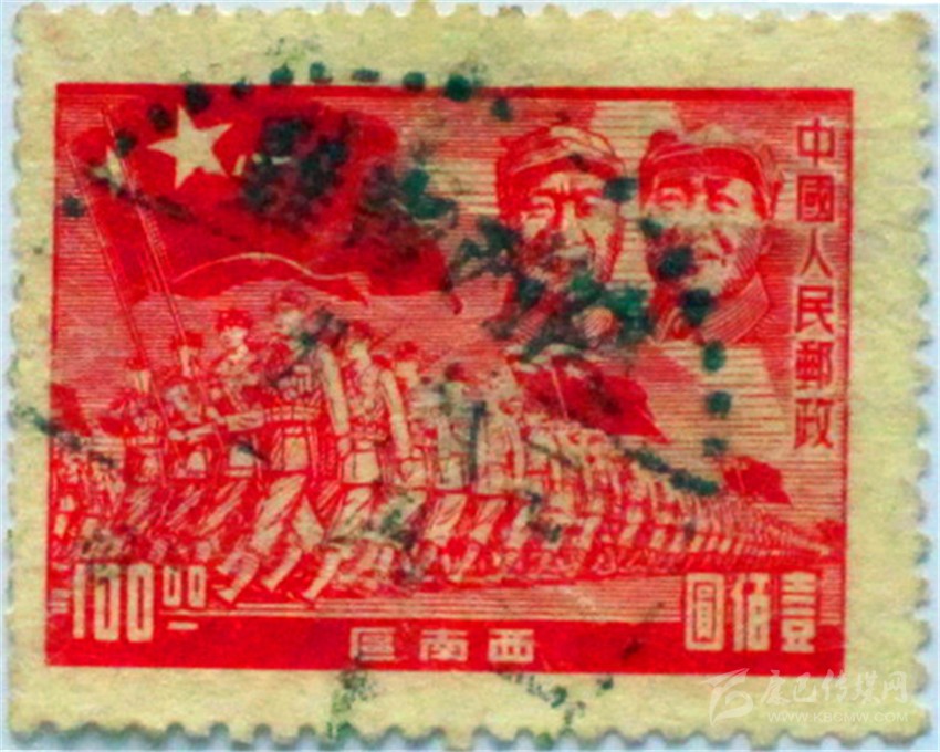 我國最早出現(xiàn)“八一軍旗”的郵票,是1949年8月1日, 剛解放的上海華東人民郵政發(fā)行的《中國人民解放軍建軍22周年》俗稱《華東進(jìn)軍圖》郵票(圖1),一套5枚,同圖異色異值,郵票右上方為毛澤東主席和朱德總司令頭像,下方是鐵流般的人民軍隊高舉著一面面“八一軍旗”。 同年12月,西南區(qū)人民郵政又發(fā)行一套11枚圖案相同“西南進(jìn)軍圖”郵票(圖2)。