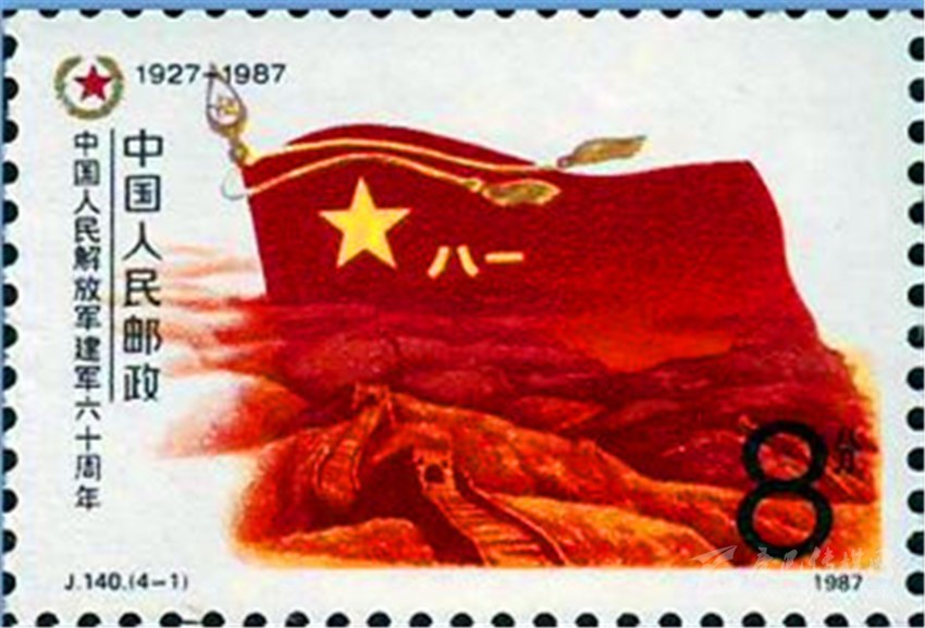1987年8月1日原郵電部發(fā)行的《中國人民解放軍建軍60周年》紀(jì)念郵票一套4枚。其中第1枚“軍魂”(圖4),郵票上一面鮮紅的“八一”軍旗迎風(fēng)飄揚,旗下是蜿蜒的萬里長城,代表了中國人民解放軍是保衛(wèi)祖國和人民的“鋼鐵長城”。
