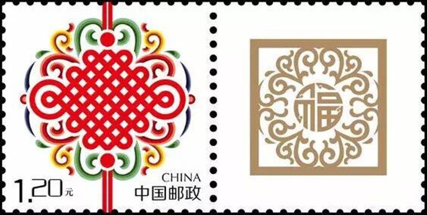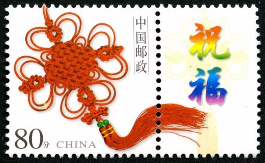 2002年5月10日,中國郵政發(fā)行《如意》個性化服務(wù)專用郵票一枚。主票圖案為如意柄端系著一個紅色“中國結(jié)”,附票有“祝?!倍郑?2003年3月3日,中國郵政發(fā)行《同心結(jié)》個性化服務(wù)專用郵票一枚。主票圖案為盤長結(jié)4邊編織有心型繩結(jié)的同心結(jié),附票為“祝?!倍?;2006年9月25日,中國郵政發(fā)行《中華全國歸國華僑聯(lián)合會成立五十周年》紀(jì)念郵票一枚。圖案為阿拉伯?dāng)?shù)字“5”與中華全國歸國華僑聯(lián)合會圓形會徽組成數(shù)字“50”,象征全國僑聯(lián)五十周年,背景畫面為淡淡的粉紅色“中國結(jié)”。寓意歸國華僑與全國人民血肉相連,同心同德共同建設(shè)美好家園;2013年8月8日,中國郵政發(fā)行一枚《美好祝福》賀卡專用郵票,圖案為象征喜慶的紅色“中國結(jié)”;2014年9月20日,中國郵政發(fā)行《中國夢(二)——民族振興》特種郵票,其中第四枚“民族團(tuán)結(jié)”,圖案中載歌載舞的各民族群眾上方有一個大紅的“中國結(jié)”,象征著各民族大團(tuán)結(jié)。