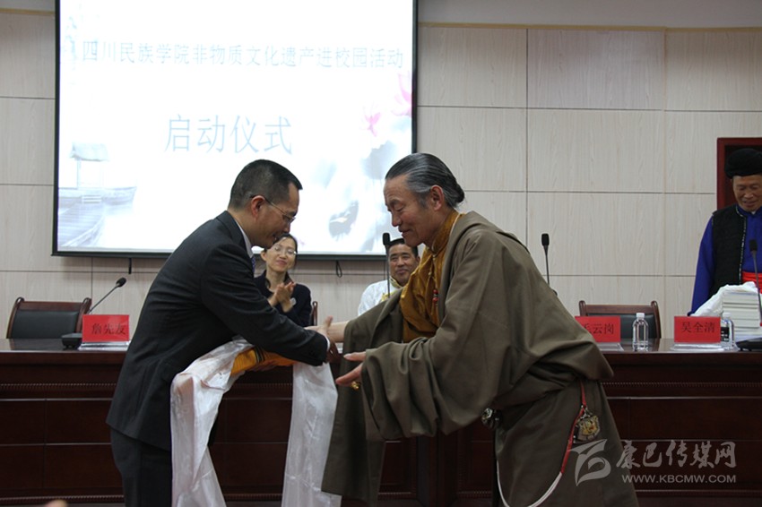 現場,世界非物質文化遺產《格薩爾》說唱傳承人阿尼、州級非物質文化《瀘定山歌》代表性傳承人吳全清分別將自己在非物質文化遺產研究過程中撰寫的經文、書籍贈送給學院。此外,省級非遺文化嵐安鍋莊代表性傳承人黃能貴、音樂舞蹈學院教師邱敏作為代表發(fā)言。