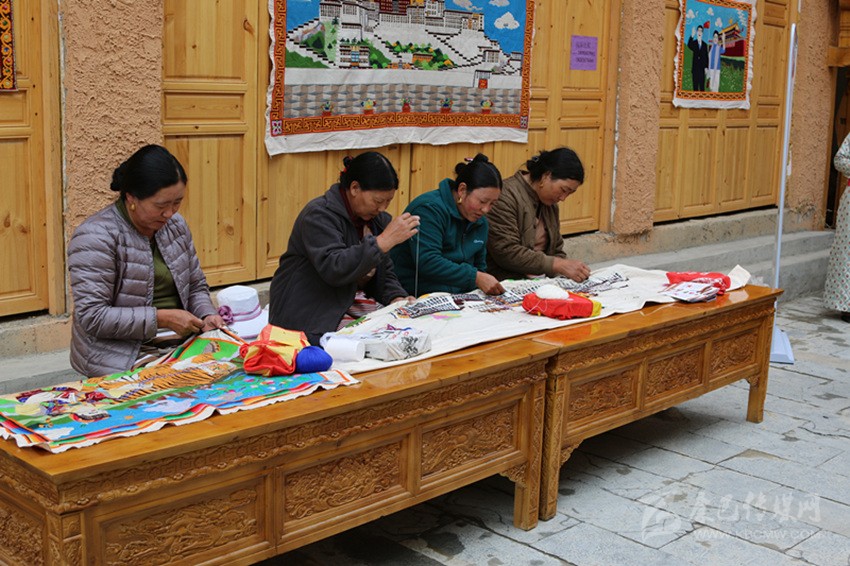 在藏繡展點(diǎn),5名農(nóng)牧民婦女正在合繡一幅藏族建筑刺繡作品。“我從16歲開(kāi)始跟著父親學(xué)藏繡,傳到我這已經(jīng)是第四代了。除了‘六長(zhǎng)壽’、度母像等傳統(tǒng)圖案,今年是新中國(guó)成立70周年,我還繡了一幅天安門作品。”47歲的傳承人達(dá)打介紹道。