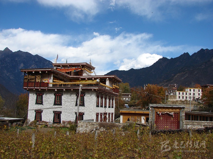 當(dāng)翻過(guò)一處斷崖,眼前豁然開(kāi)朗。一大片平整的田地出現(xiàn)在我們的面前。田地里,一棟棟白色的藏房或鶴立雞群,或三五聚集,看似毫無(wú)規(guī)律,其實(shí)從整個(gè)房屋大門(mén)的朝向可以看出,在房基的選擇時(shí),對(duì)陽(yáng)光的接納面、風(fēng)水等都作了充分的考慮。