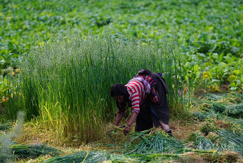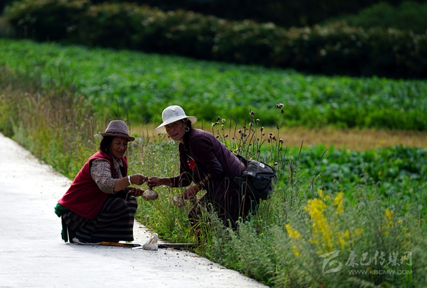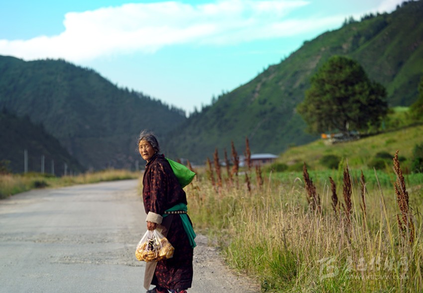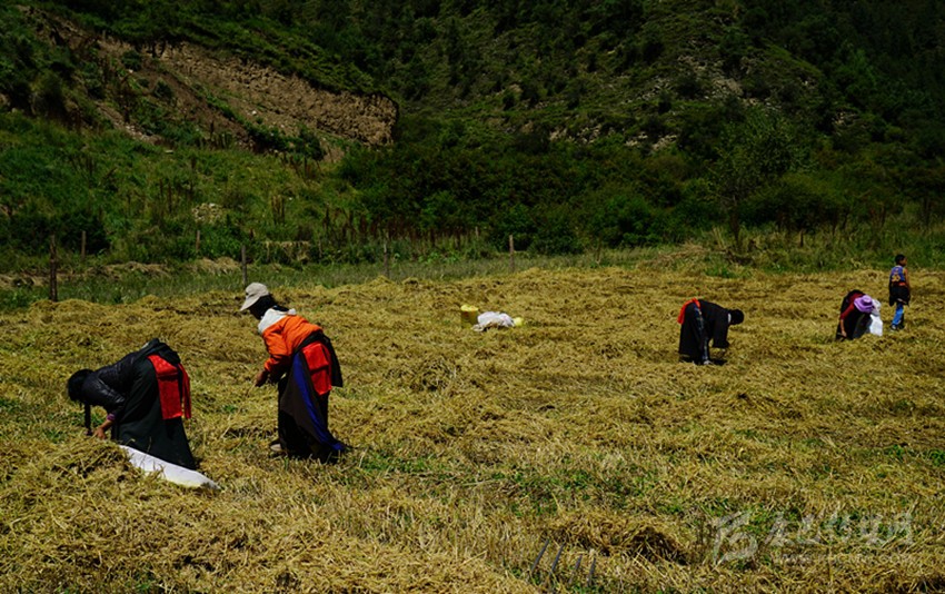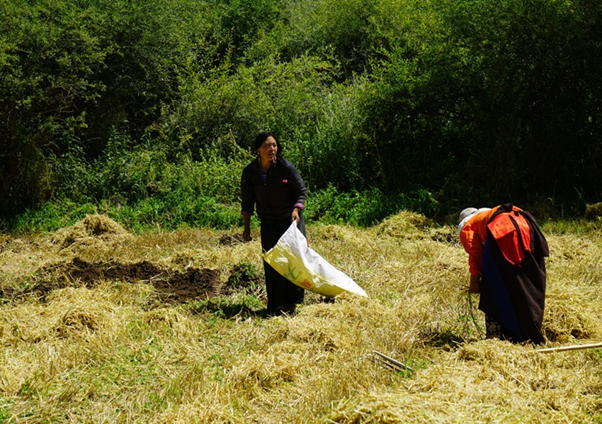 開(kāi)始收割了,從坡地到川地,到處是收割機(jī)的聲音。青稞是車巴溝的主要作物,因?yàn)橐デ囡妫贼佤?。村里人忙得團(tuán)團(tuán)轉(zhuǎn),收割機(jī)開(kāi)過(guò)去,大家就跟在后面撿穗子。如此往復(fù),一直要到糧食拉到家里。