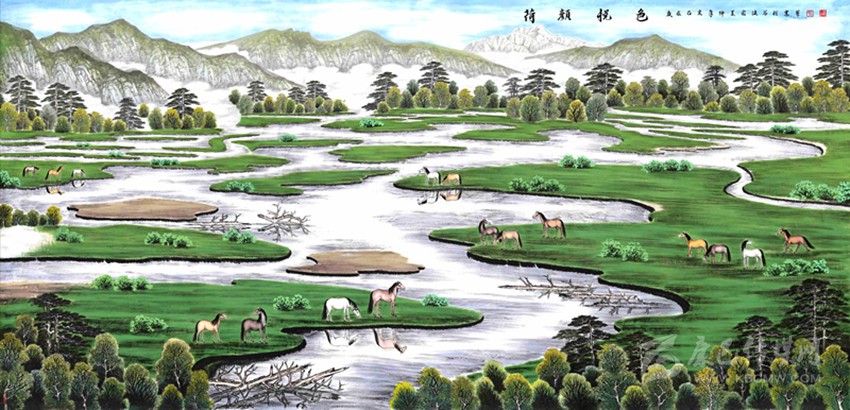 裴洪波告訴記者,經實地取景后,麥崩特色結合大渡河舊稱,《沐水歡歌》一畫應運而生。該幅畫作的“新”主要表現在兩方面,一是新時代下魚通人的新生活。二是畫作色彩運用上的新穎。其中,新生活方面,隨著脫貧攻堅、鄉(xiāng)村振興的推進,麥崩村民們過上了幸福生活。色彩新穎方面,區(qū)別于其余“康定新八景”,《沐水歡歌》更多地采用了中國畫的青綠山水畫法。