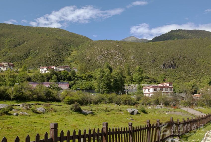 折多塘村房舍現(xiàn)多數(shù)沿公路兩側(cè)筑建。其實(shí)沒(méi)通公路前,山間馱道應(yīng)是村后呈椅狀的一片草坡上。草坡邊自古就有的一方露天溫泉池塘水霧彌漫,熱氣蒸騰,正應(yīng)了前人所記“山凹有熱泉沸起”、“憇啞池塘,帳宿于折多”;且在舊時(shí)馭馬馱牛的行旅中宿棧,這寬大的草坪方適合繃搭帳蓬和放牧牲畜,露天溫泉又可洗濯行旅之勞頓。