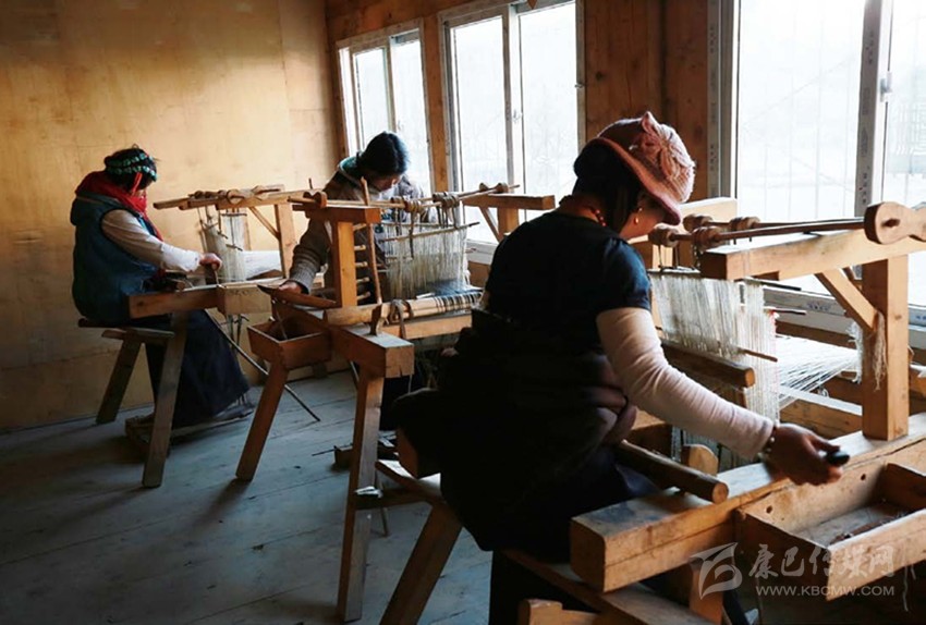 2003年,“編織班”邀請澤巴姆為老師,將這項技藝傳承了下來。現在,澤巴姆年紀大了,牛羊毛絨編織這樣繁復又耗體力的事情她不再做了,全交給了自己的媳婦扎西巴姆——當地唯一的牛羊絨編織老師。第二天,我們在編織班的工坊里見到了扎西巴姆。工坊一角的木架上擺著為數不多的圍巾、墊毯等產品,窗邊平行擺著六臺織機,扎西巴姆正帶著幾個藏族婦女坐在其間飛梭走線。陽光從窗戶透進來,投射在織機和織女們身上,古老的場景、緩慢的節(jié)奏恍惚把我?guī)Щ亓俗婺傅臅r代。扎西巴姆說,當地人稱牦牛絨為