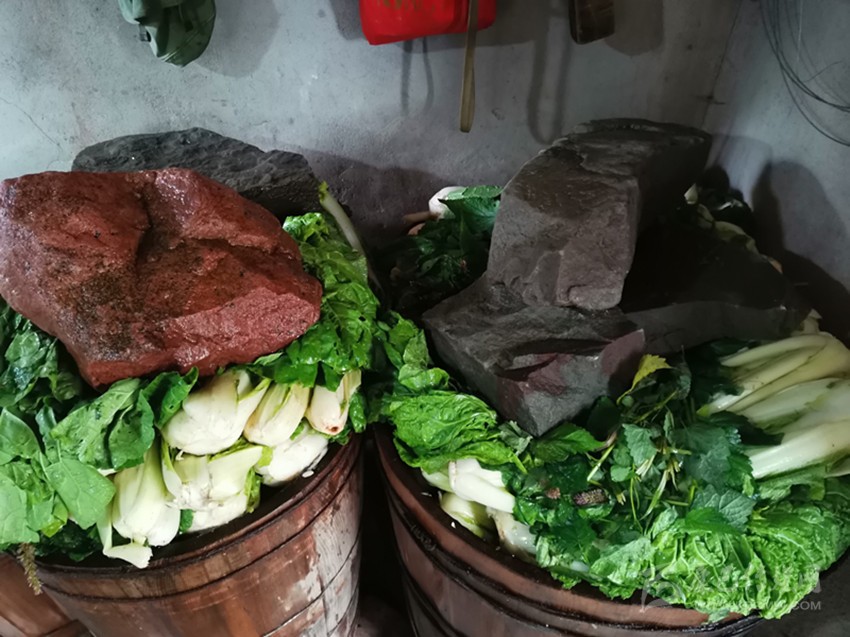 舊時化林坪家家都做鹽菜炒臘肉,為何李汝珍卻能在周家客棧的灶上烹調(diào)出這獨一份美味呢,原因就在這鹽白菜上面。據(jù)周家后人講述,李汝珍當年對鹽白菜的制作頗為在行,從選材、抹料到腌制、晾曬,每個步驟每一種材料都非常講究。她用作腌菜的食材需葉片長肉質(zhì)厚的半包心本地大白菜,花椒粉則選用麻香味醇的漢源花椒,所需之水必須為本地山泉,她還特意在腌制時加入茴香苗、藿香葉等香料,在木桶或水缸上以巖石加壓更是匠心獨具。精心制作的鹽白菜,常常晾曬于客棧屋檐下或墻外各處,以其醇香之味吸引客人前來。久而久之,周家客棧鹽白菜的美味之名被背夫們帶到各地,“鹽白菜炒臘肉”也成了茶馬古道上的一道名菜。