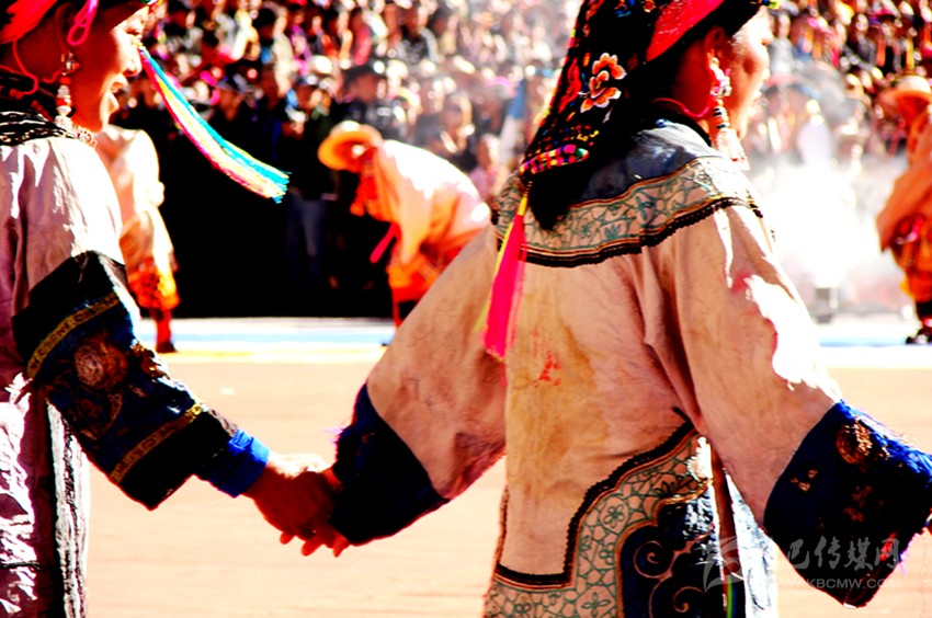 在婦女面前,腰部以下直達(dá)腳踝處,有寬約二十厘米左右的條狀絲綢布料,藏語稱為“仲巴”。這一條狀服飾,面料全部用絲織品制作而成。上面的圖案多為牡丹、杏花等花卉,也有龍虎、麒麟、雙龍、鳳凰等圖案的。裙擺外沿用絲織品鎖邊,絲織品上多有云紋,也有鮮花刺繡。顏色的搭配較為鮮艷,與中間的主題圖案之間形成一種強(qiáng)烈的對比,讓服飾之間的主次一目了然。