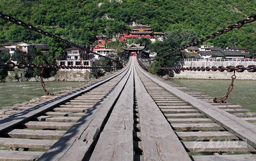 站在岸頭眺望,不遠(yuǎn)處凌空橫跨一座懸掛式的鐵索橋,長虹般地飛躍顯示出它的磅礴氣勢與雄壯高大,波濤滾滾的大渡河,像千萬匹脫韁的怒馬,從峽谷中大聲吼叫著飛奔而來砰然萬里;行人在橋面上走動(dòng),仿佛在蕩秋千,腳下漂浮不定,步履蹣跚。人數(shù)稍多時(shí),橋面便晃晃悠悠,感到頭重腳輕,想踩穩(wěn)腳步著實(shí)不易。洶涌澎湃的狂濤讓人瞬間感覺暈暈乎乎,顫顫巍巍。此情此景,印證了流傳在當(dāng)?shù)乩习傩罩械膬删浯蛴驮姡捍蠖珊永锢藵凉?,鐵索橋上打閃閃;此時(shí)此刻,游客才真正體驗(yàn)和感悟得到紅軍22勇士當(dāng)年冒著敵人的槍林彈約,飛奪瀘定橋時(shí)有何等的艱難與險(xiǎn)阻……
